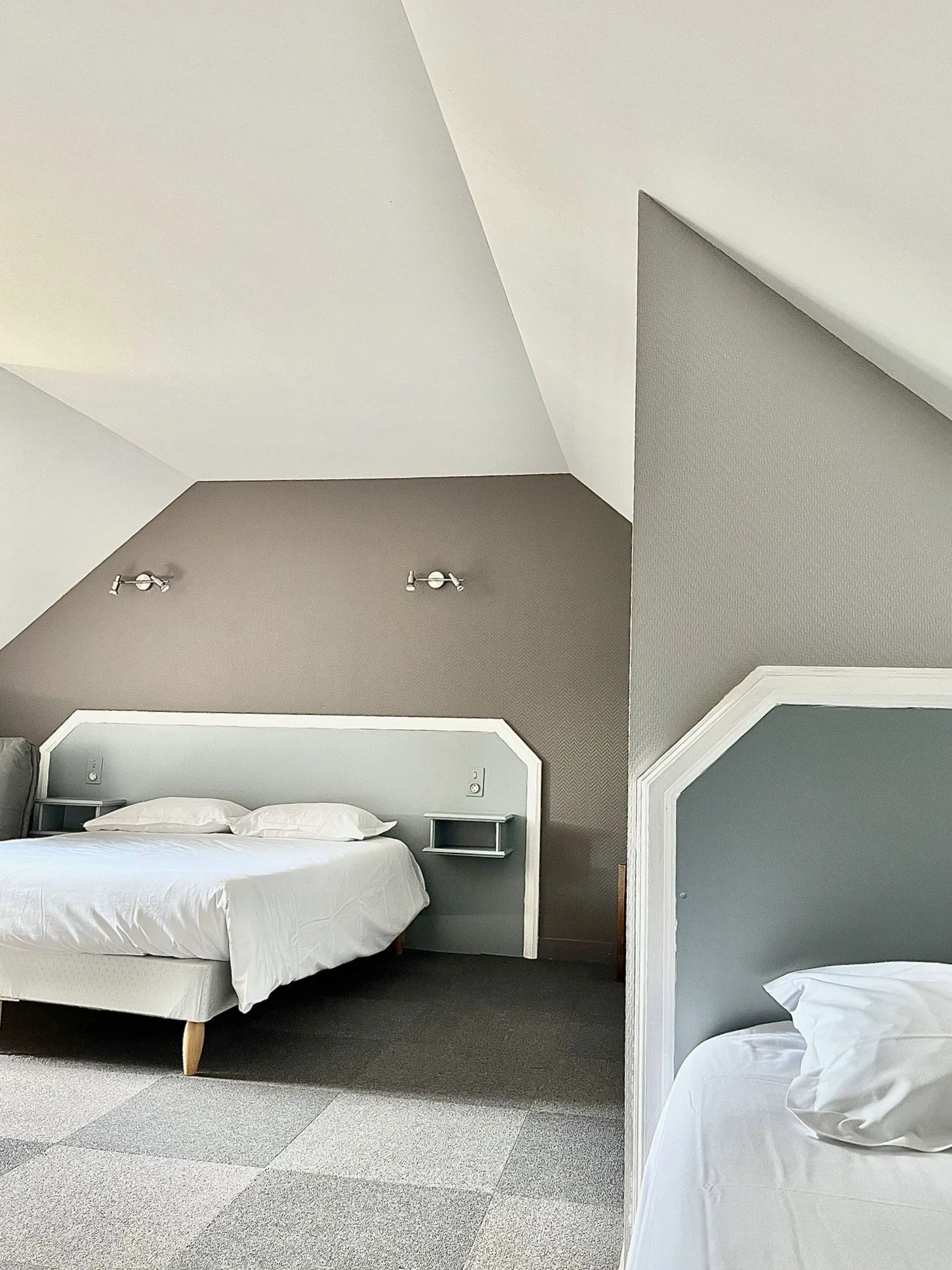 Idéale pour les amis ou les collègues de voyage, cette chambre offre deux lits simples séparés. D'une superficie d'environ 16m2, elle peut être située au rez-de-chaussée ou au premier étage, et comprend une salle de bain privée avec douche et un bureau.